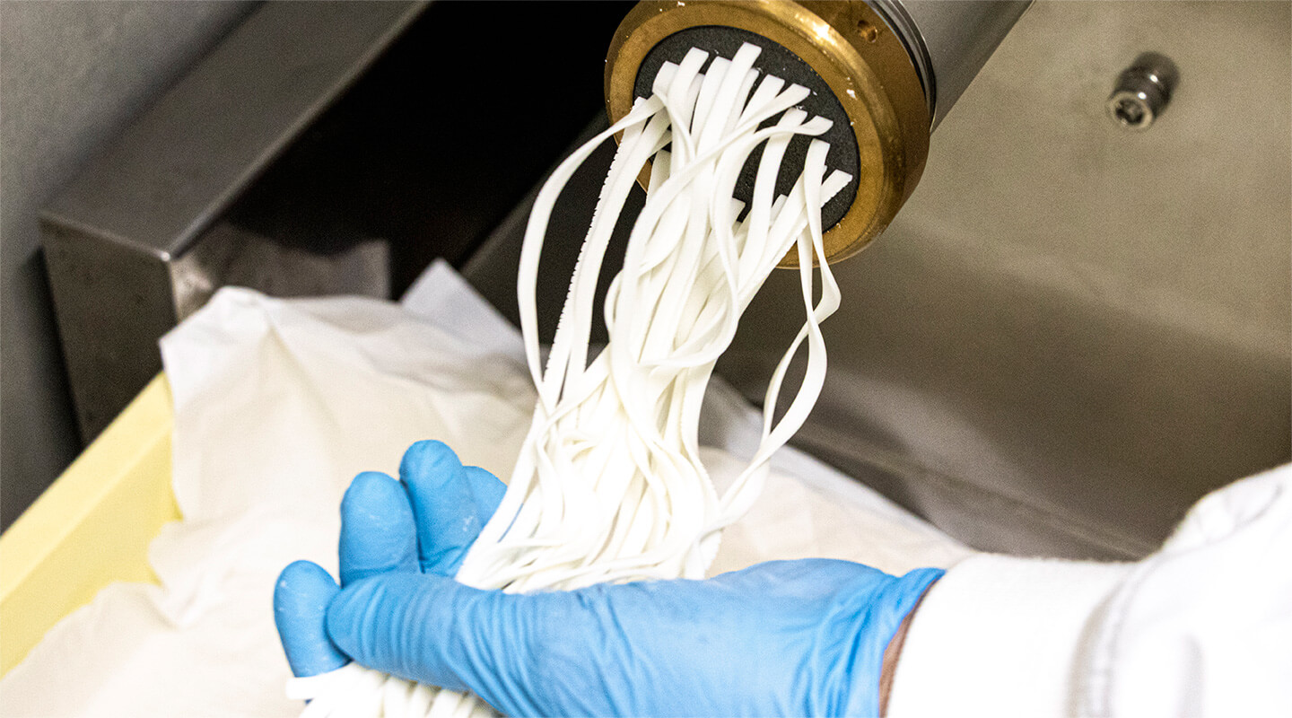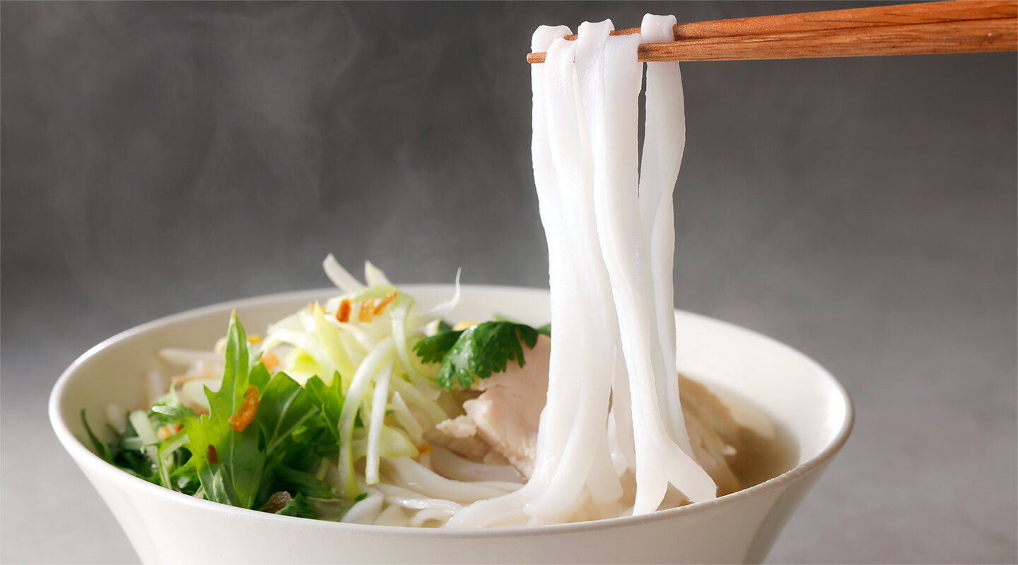 モチモチの食感と喉越しにこだわったオリジナルの半生タイプの米麺は北海道産米「ゆめぴりか」を使用。